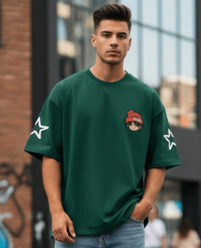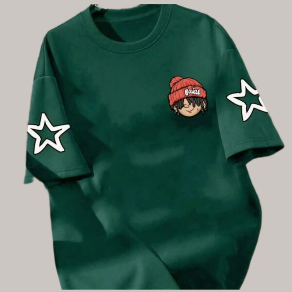 Dark green oversized T-shirt with trendy cartoon chest print aur star sleeve print. Soft cotton fabric ke saath stylish aur comfortable daily wear option.